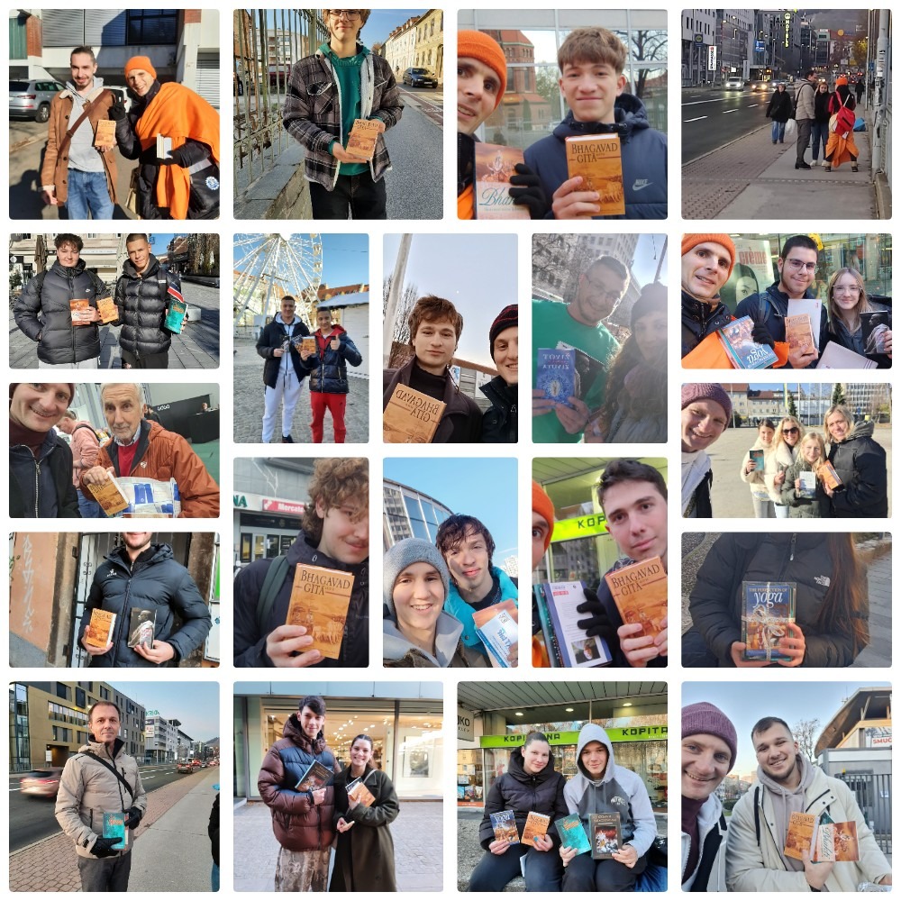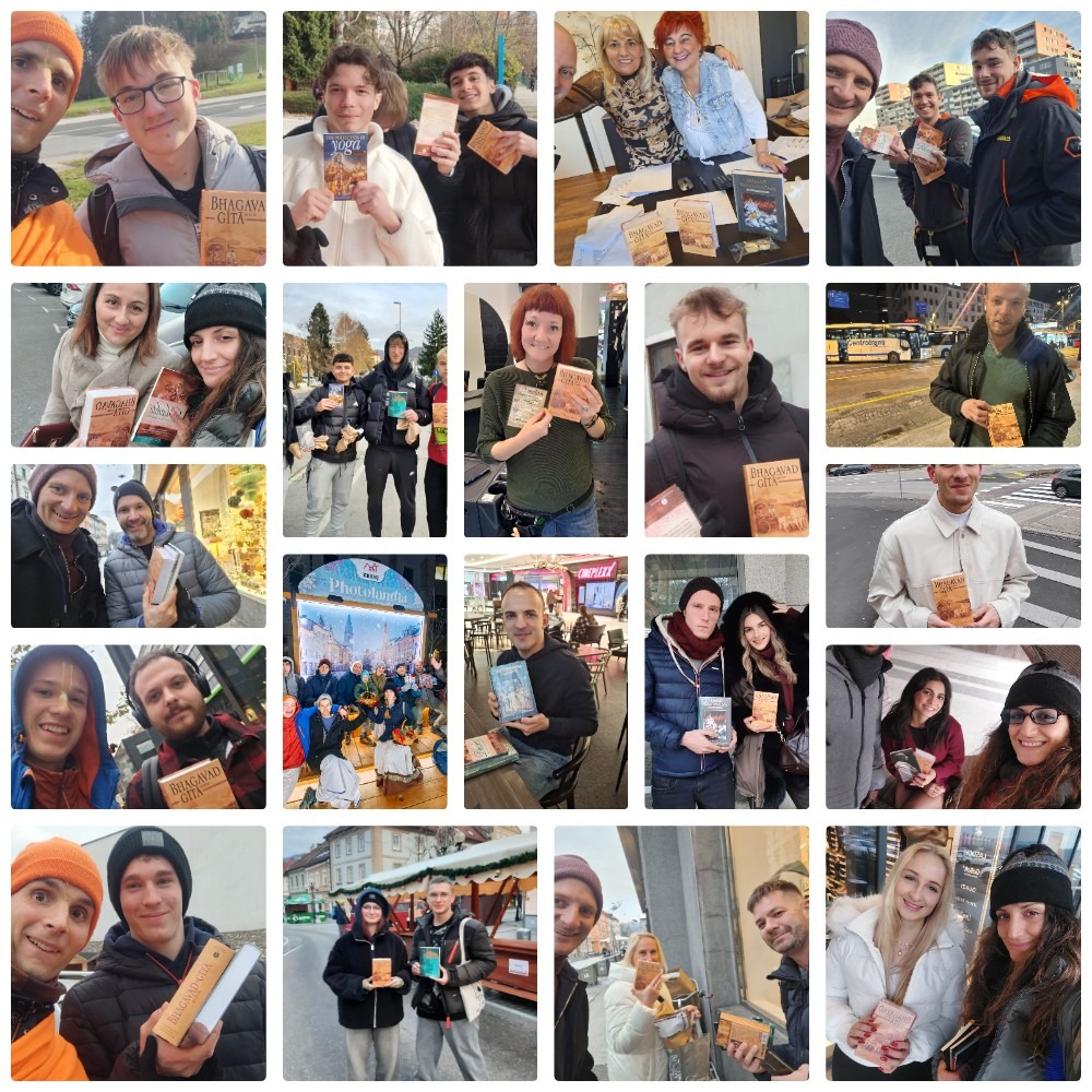 This year, during the Govardhan Puja festival, Balazs, who is now very favorable toward devotional life, shared that his friend, who oversees twelve Tesco supermarkets across Hungary, was happy to allow us to set up book tables and distribute inside the stores in Vaishnava attire. Compared to the wet, cold, and windy parking lots, the atmosphere felt heavenly: people gladly took books, showed genuine appreciation, and many full sets and large stacks were distributed with ease.