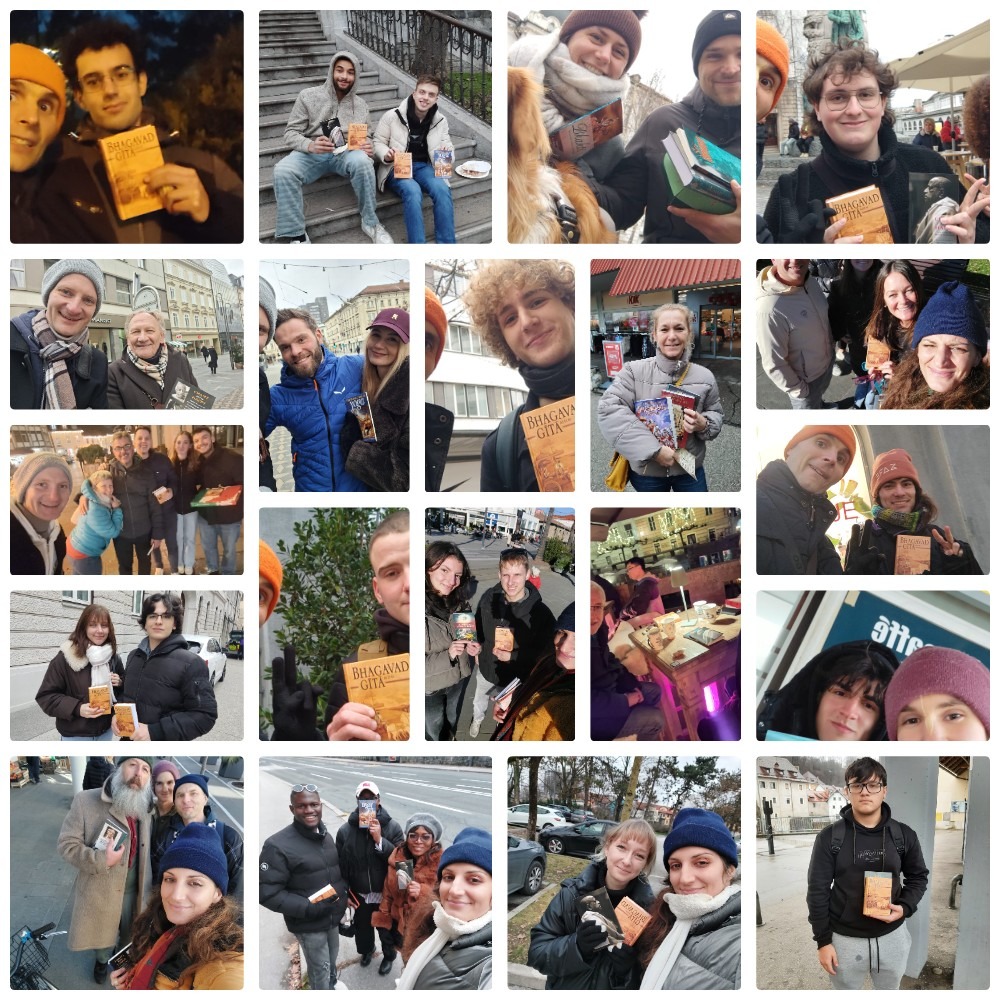 I moved on, and after finishing my chore, I went to the shopping street to see how it looks—maybe I can distribute something. Give Krishna to someone. I thought that everything would be closed, but apparently there were still some people visiting the Christmas fair. So I was standing there, observing the space. The people, the patterns, the way they move. I noticed I was still hesitating, and maybe choosing too much. I must get more active. So I prayed, having this meditation to just be there available for Krishna, so that He sends me those who are ready to receive Him. I'm just there to give the books, trying not to think of results or donations, just be there. Soon a few Indian people came, on a short trip from Germany. They were happy to see me and the tilak and the books; they asked for photos. They were a mix of different people. One from Russia, one from Palestine. They got a small book, and one more. A few people I met, but they were not particularly open to having a book for different reasons, but still were curious and shared their views—favourable, just not ready yet. Many of them already knew the devotees, or had seen or heard the mantra, or had friends who joined. Two of them said they were in Athens and they saw the devotees distributing in the city center and they offered them a cake! I know exactly where. One of them, after a short inspiring conversation, while leaving told me, "Life is magical, anything can happen!" Then it had already been some time without visible "results." I wondered, "Should I stay or move further down?" Yes, concentrate more. Pray more. "Krishna, where are those people You wanted to send? Are they coming? Should I stay here? Wait for them?" Move around a bit, feel the space, and it felt as if there was something special there. So I waited. Then this lady came. She was wearing a red scarf and had an interesting vibe. When I showed her the Bhagavad Gita, she immediately recognized it and said she had it already. But where? Somewhere in a locker in the US, so she got it again today! It has to be something really special. She was sharing that she has been connecting with different deities, and she was thinking if Krishna, or someone, wants to come to her she's open, and so He came in the form of the BG. Actually, she has been studying different philosophies; she knows about the Vedas, sang mantras, she even studies Jyotish, and tried so many things, and she said loud and clear, "Vedic religion is the best religion ever," and she was feeling today that maybe she needed to go out, that something magical would happen, and she was praying for something. I shared about Narasimhadev, and she shared that she read something similar today. We were talking for a really long time and there were so many synchronicities; it was getting just better and better. We exchanged contacts and moved on. Thank you so much.