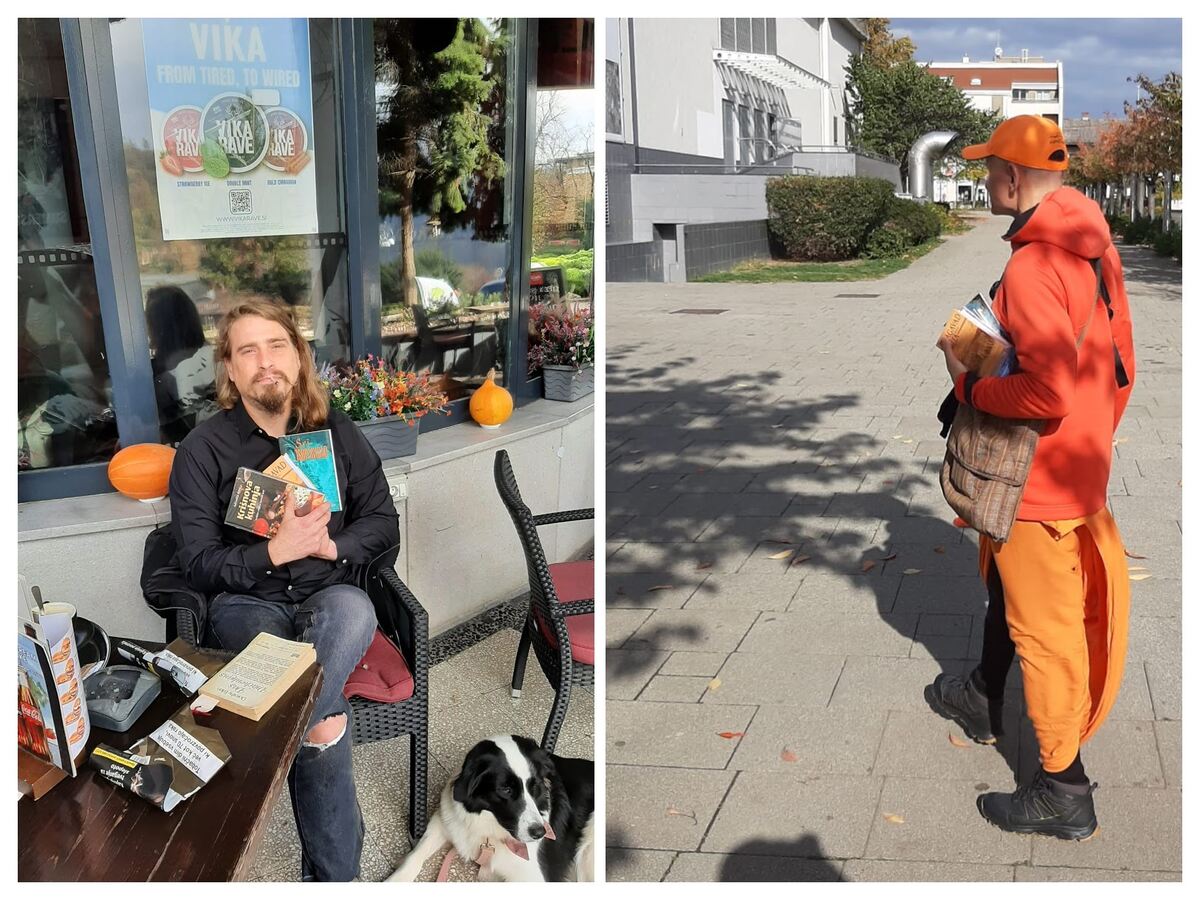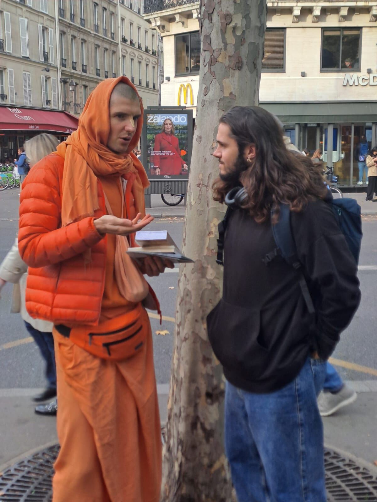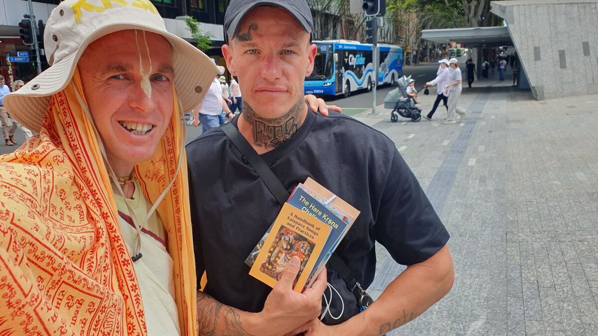 While Nitai was choosing what bhoga to bring, I decided to distribute my last Portuguese Gita in front of the store. It was not long before I noticed two alien girls crossing the street. Their style meant that they wanted to be different and free from conventional thought. They were tattoo artists from Vienna, Austria.