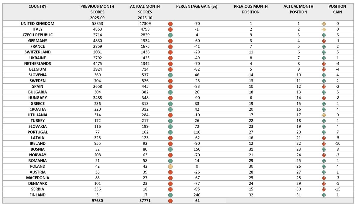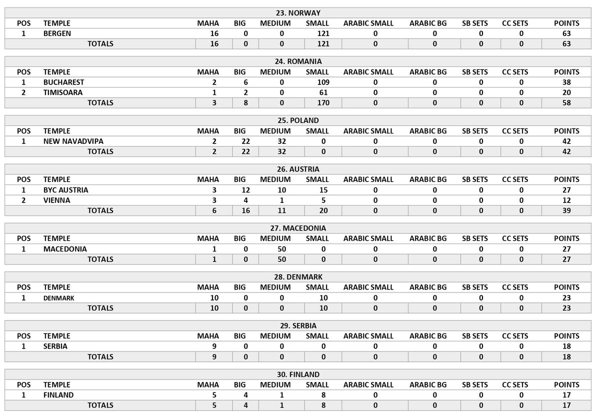 As a result, some countries decreased their distribution a little whereas others increased. Italy increased from the previous month coming back to the number one spot for continental Europe and the Czech Republic increased coming up to the number two spot for continental Europe. Most all the other countries in continental Europe decreased due to engagement in other devotional activities as well as visiting the Holy Dhams.