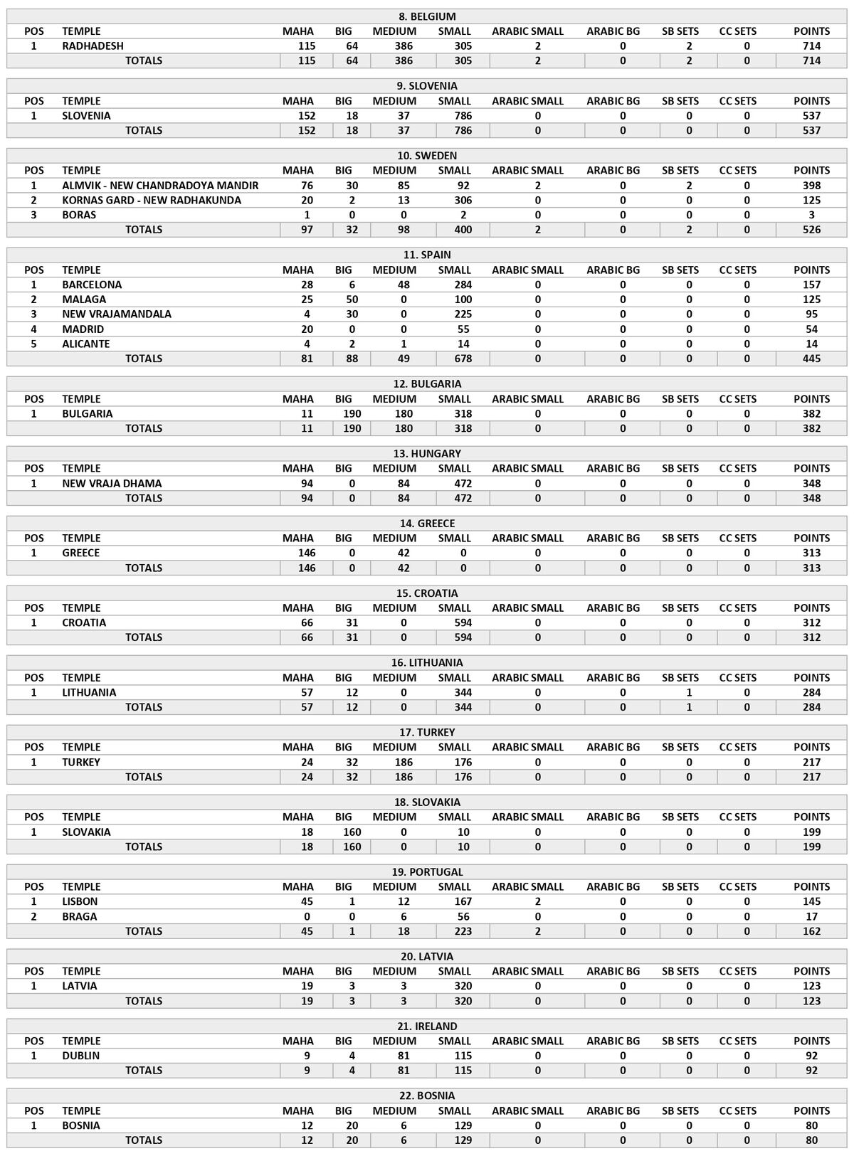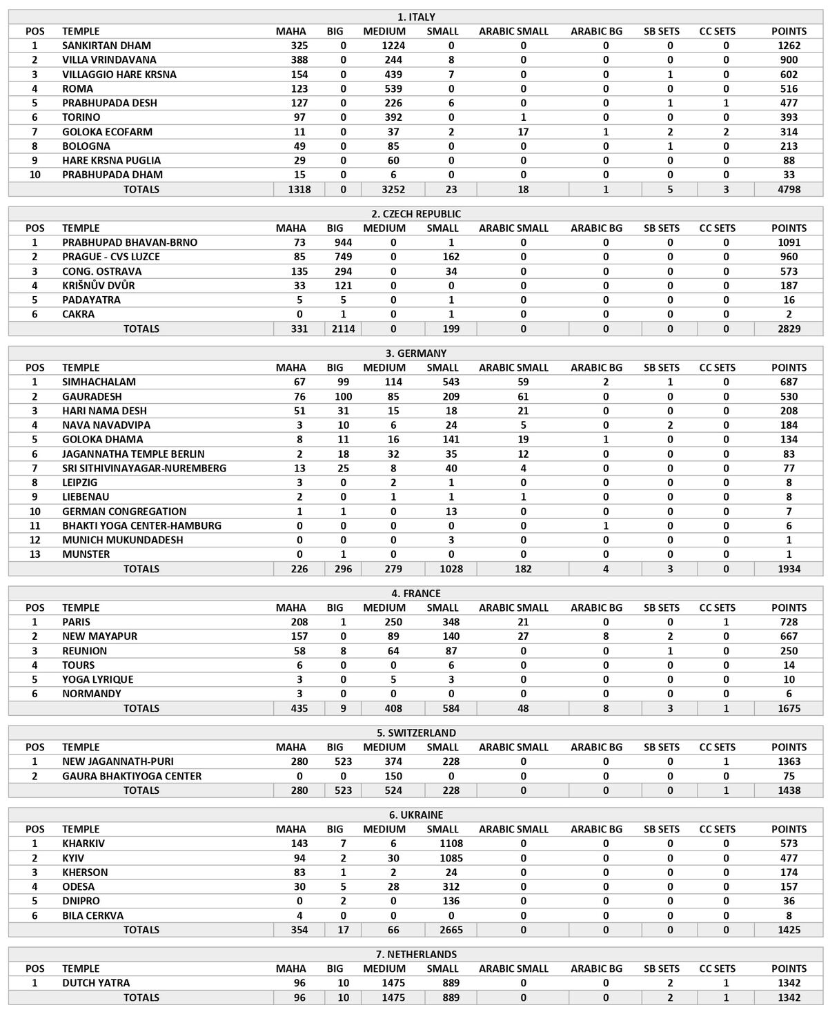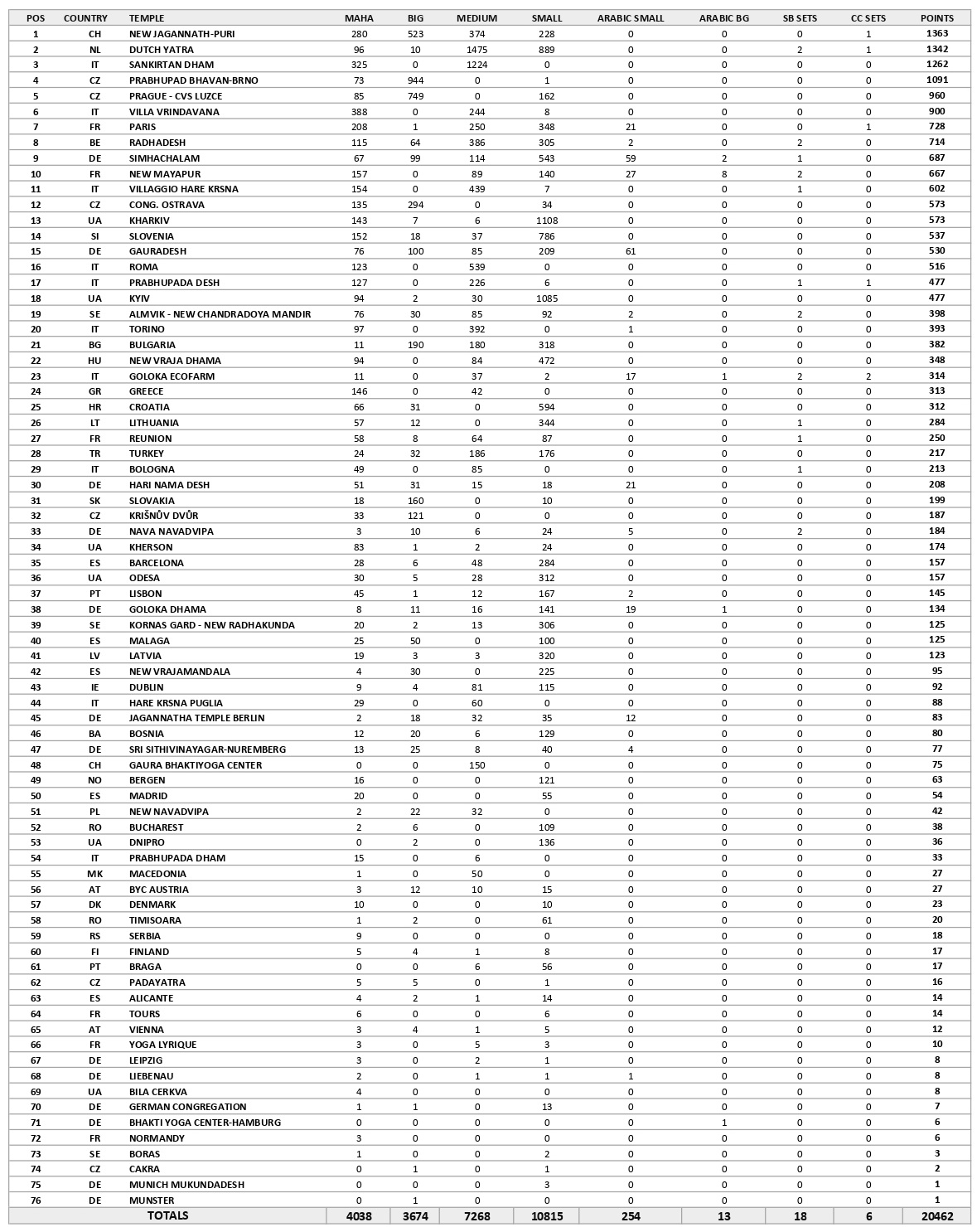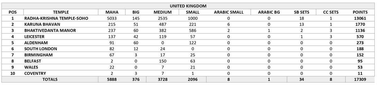 The most amazing temple of all is the Radha Londonisvara yatra with 13,061 book points almost 3 times the nearest country score. Now London is becoming the capital of the world again but this time the Sankirtan capital of the world.The rest of the UK were a little in the Kartik mode and did less than the previous month. We hope though that some of that Sankirtan energy from the UK can flow over to the rest of Europe!