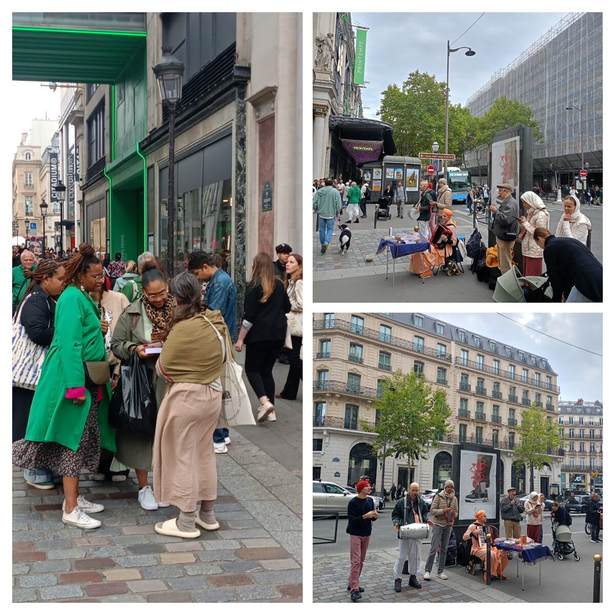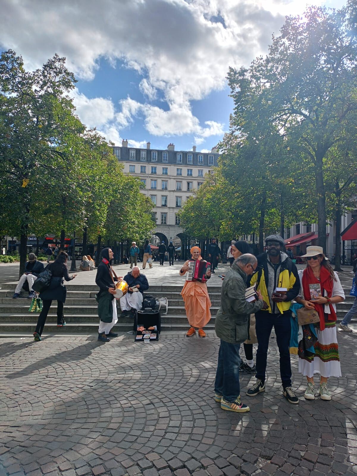 Sundays in Paris are market days. Instead of church, people go to the market. So we brought Kṛṣṇa's church of the Holy Name to the market. Usually, we would take a small journey to the local train station where the market is situated, but today, every once a year, the market came to us, just at the temple doorstep. In a few meters we hit a flee market with kartalas, whompers and drum singing Hare Kṛṣṇa. People were immediately reactive and danced, clapped, smiled and took the good of the Holy Name.