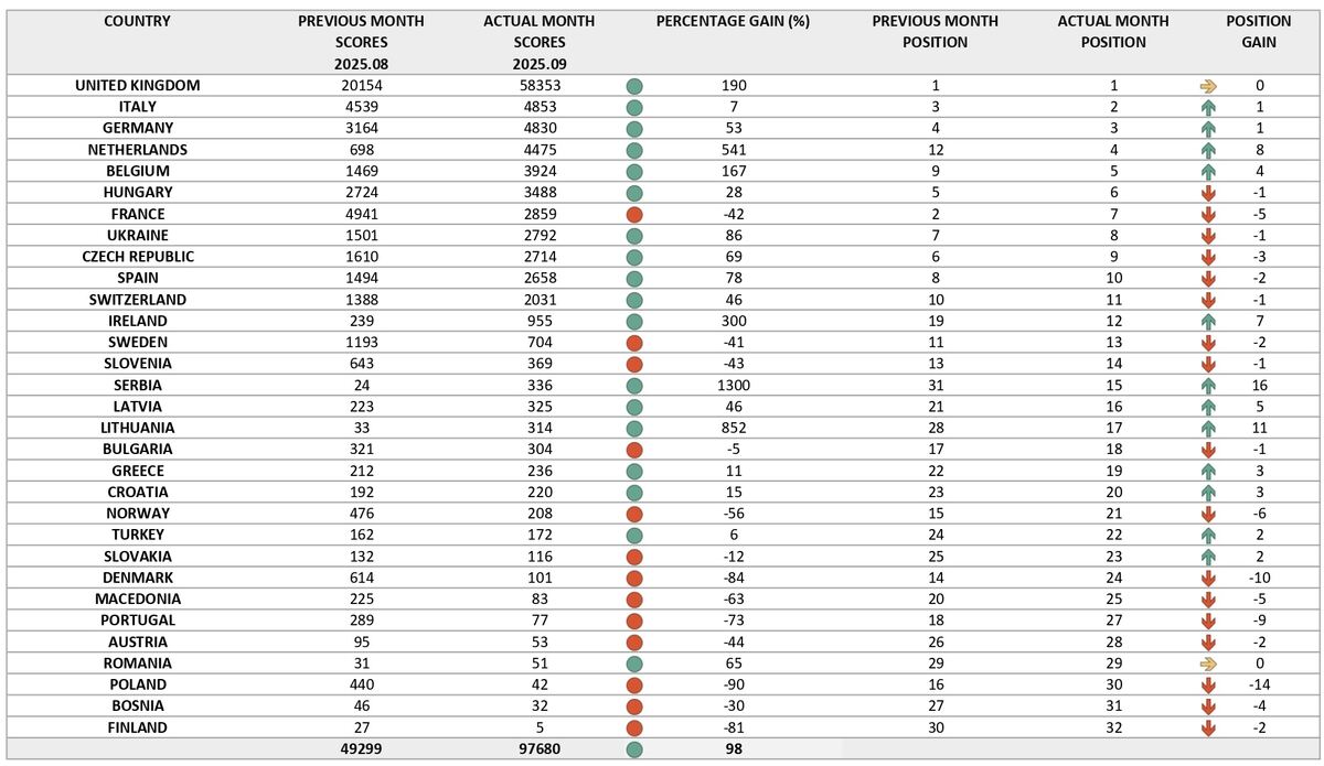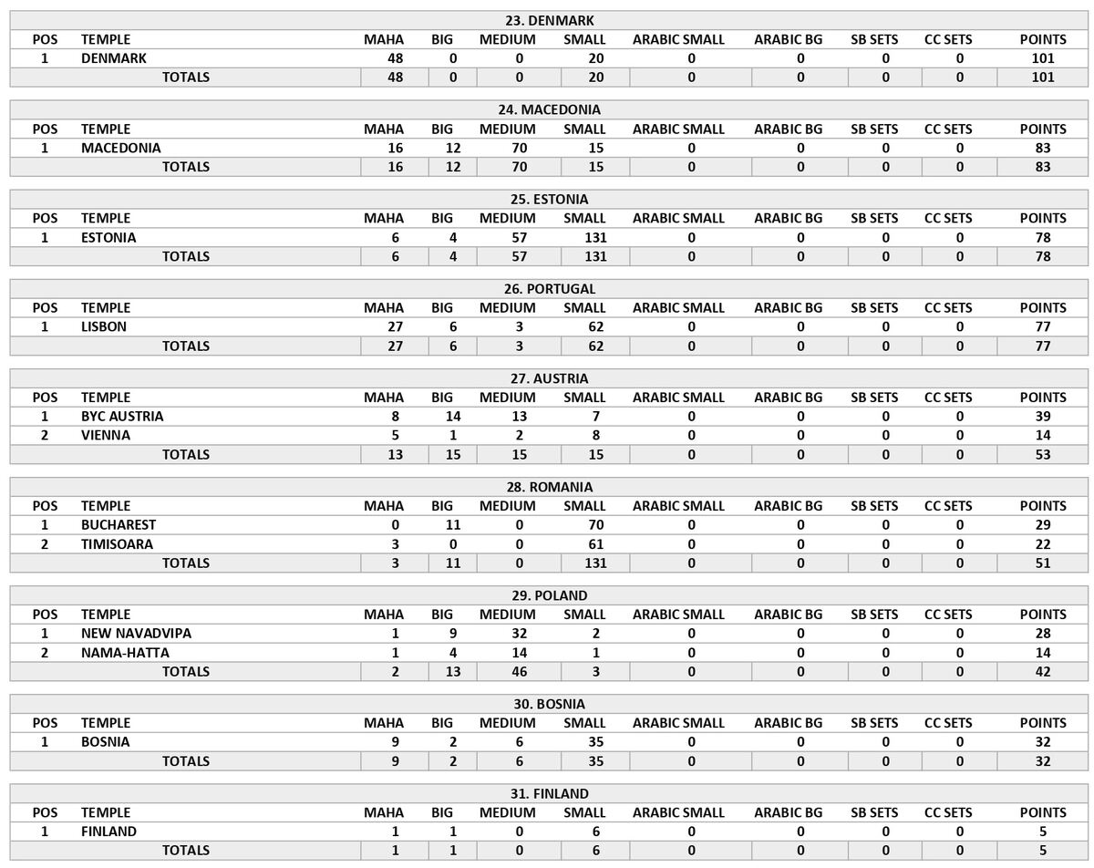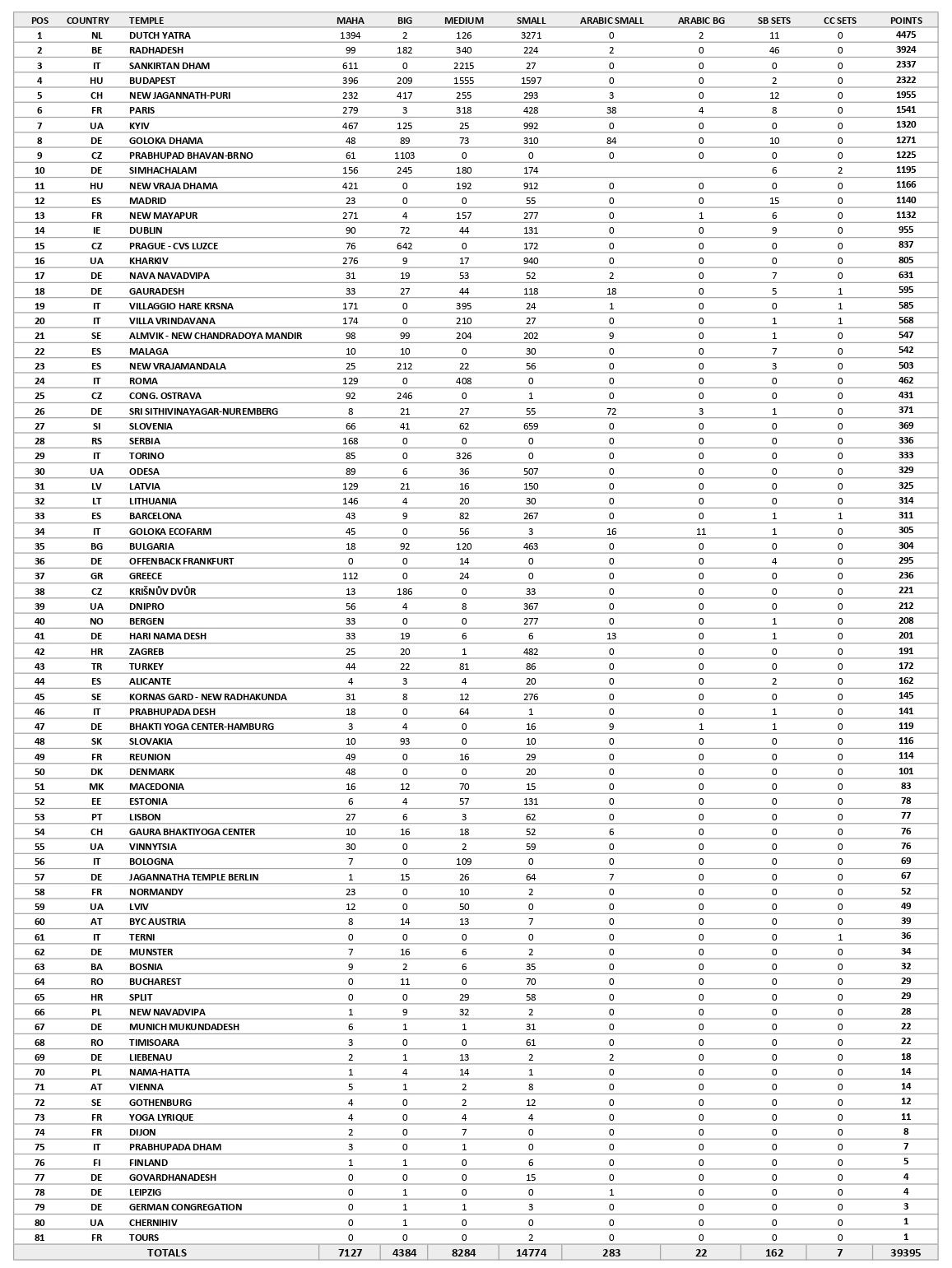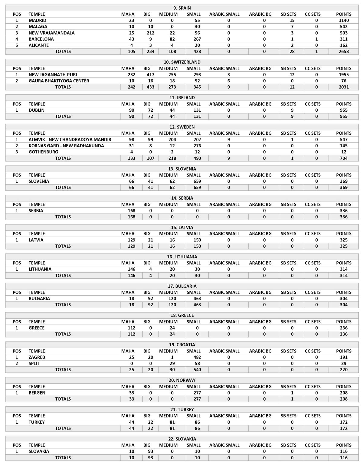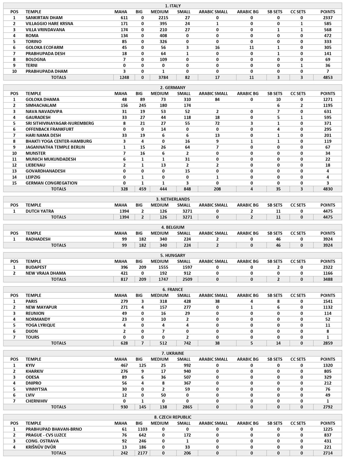 There were also many surprises in continental Europe. Italy moved back up to first place but with Germany and the Netherlands close behind. The Netherlands hasn’t done this big in a long time and also Belgium did very well. If they combined together as Benelux, they would have beat everyone. Then right behind were Hungary, France,Czech R. and Spain. Especially Hungary and Spain are increasing steadily along with Switzerland and Sweden. The tidal wave of Lord Caitanya’s and Srila Prabhupada’s mercy is growing and expanding here in Europe and the UK. All the other temples are going on steadily and this month we finally got the scores from Estonia thanks to Visvavasu Maharaja and his contacts there. Also, Latvia and Lithuania did better than usual so the Baltics are coming up nicely.