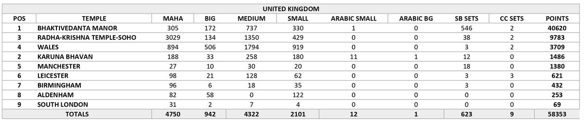 This was one of the most amazing months to date outside of the Prabhupada marathon. The biggest news comes from The Bhaktivedanta Manor with 546 Srimad Bhagawatam sets as well as many other books with a total of over 40,000 points!!!! There hasn’t been anything even close since I have been producing the newsletter. Thanks to Divyanam prabhu and all the wonderful devotees of Bhaktivedanta Manor!! Also, the other temples in the UK London Soho, Wales and Scotland did very well.