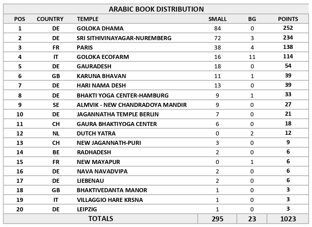 Last minute news in from Ukraine. They came in just behind France and right above the Czech Republic. They are real heros in Lord Caitanya’s Sankirtan movement going on distributing Srila Prabhupada’s books in such difficult circumstances.