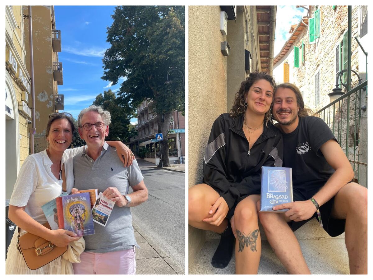 During last Harinam, I approached a British couple, who was watching their teenage son buying books at Book table.