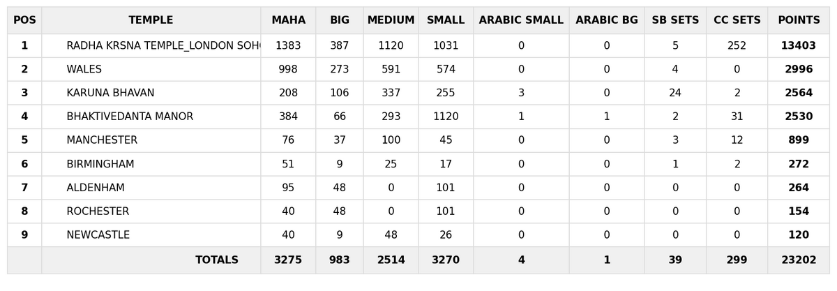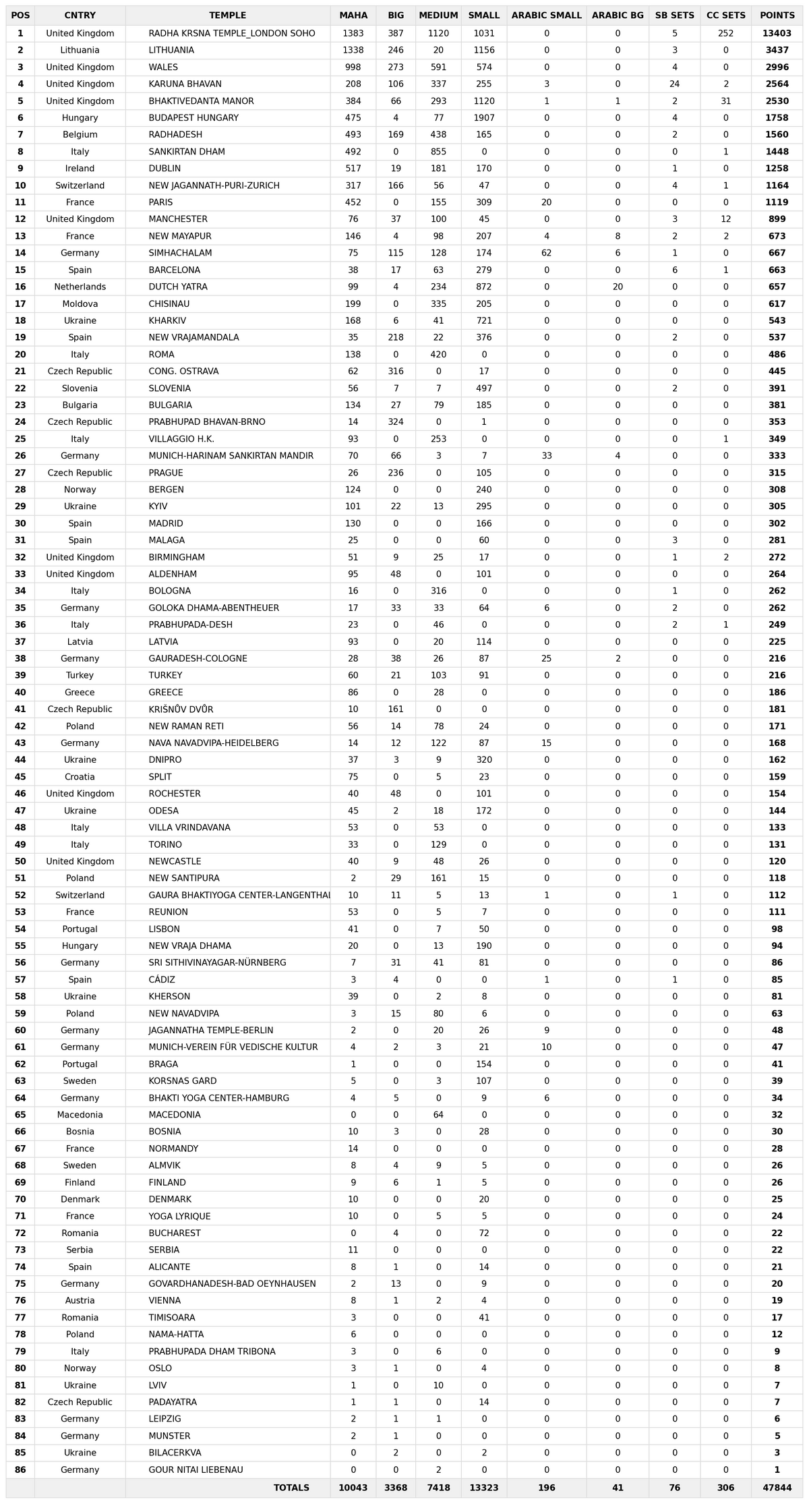 FLASH Sono arrivati all'ultimo momento i punteggi sia dalla Moldavia che dall'Ucraina; sono sempre molto stimolanti, considerando la situazione in Ucraina. Siamo anche molto felici di avere la Moldavia nella Newsletter e di vedere che distribuiscono così tanti libri di Srila Prabhupada.
