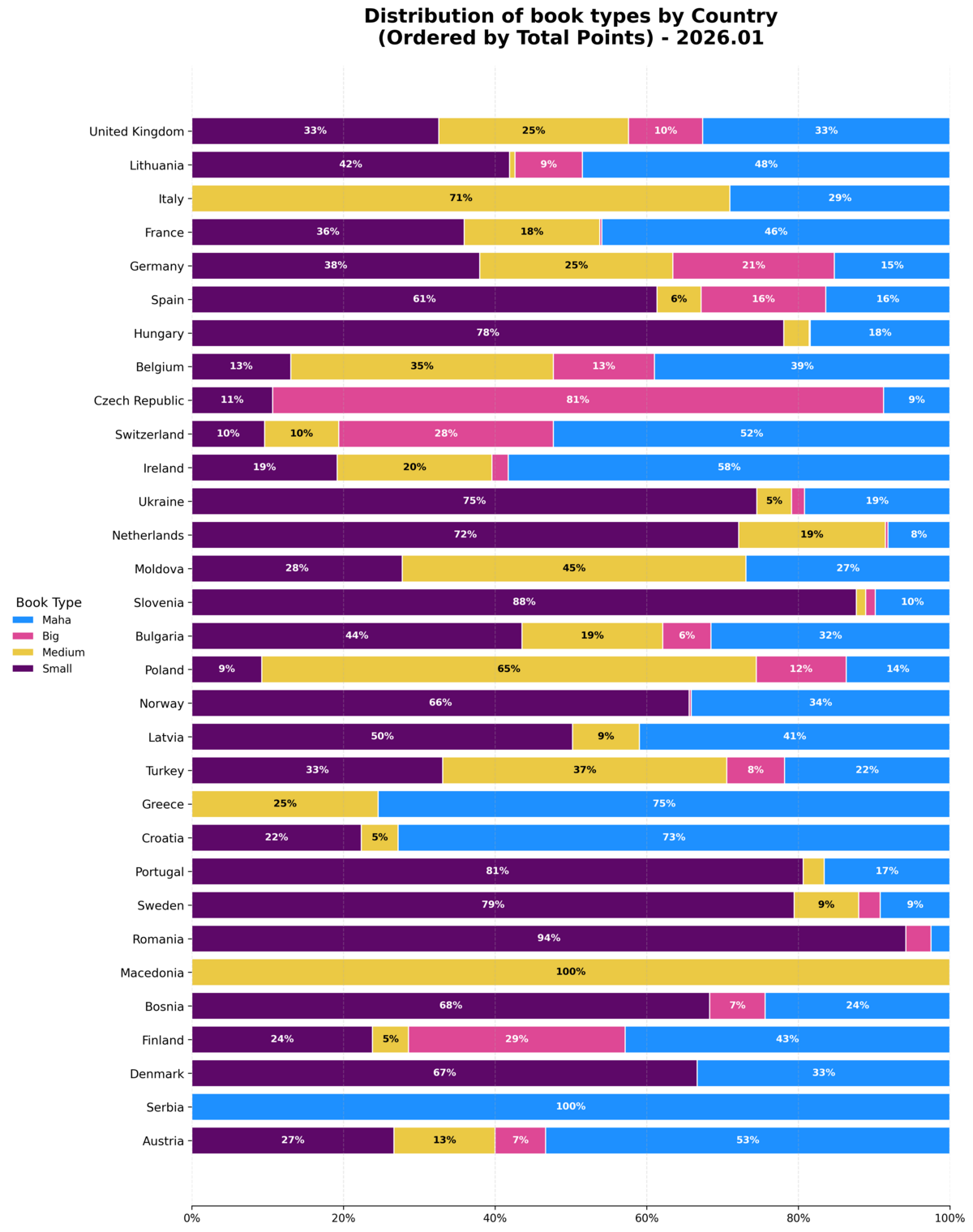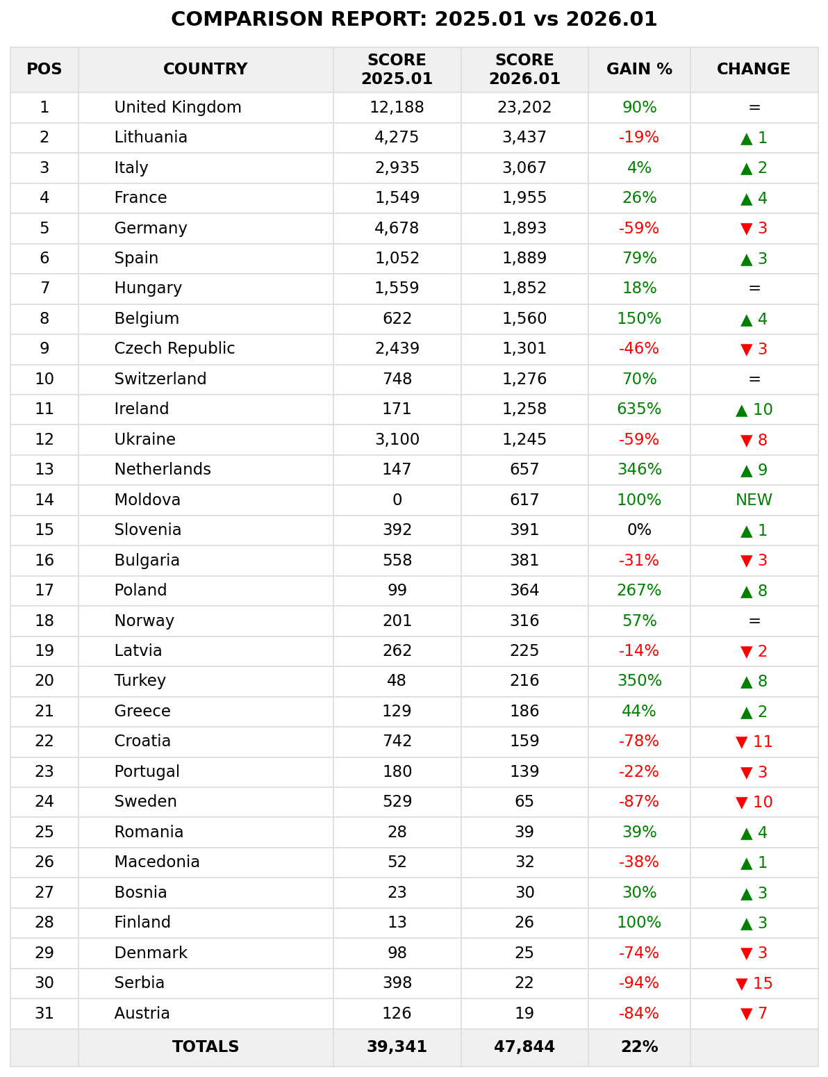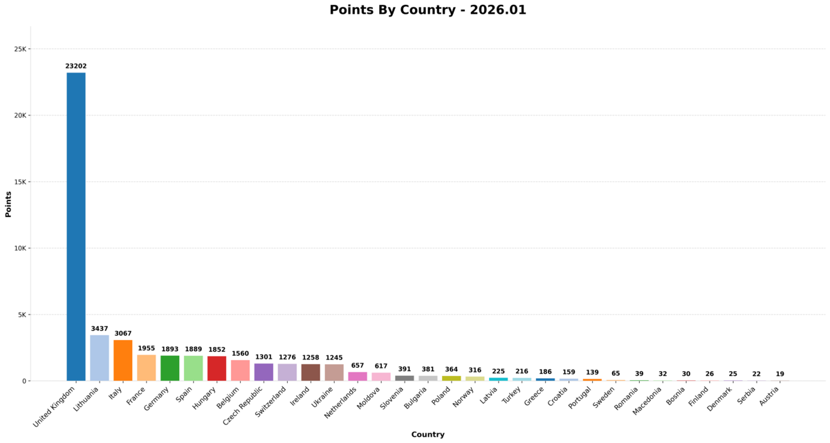 In Europa i devoti sono rimasti stabili, ma una grande sorpresa è arrivata dalla Lituania. Hanno fatto molto di più del secondo paese, l'Italia. Com'è possibile in un paese così piccolo? Ho scoperto che hanno inserito la maggior parte dei loro punteggi di dicembre a gennaio. Tuttavia, i loro punteggi anche a dicembre erano molto buoni considerando le dimensioni del paese e i loro punteggi abituali. Tutti gli altri paesi hanno mantenuto le loro posizioni abituali, con l'Italia al secondo posto, seguita da Francia, Germania, Spagna, Ungheria, Repubblica Ceca e Svizzera che hanno ottenuto ottimi risultati.